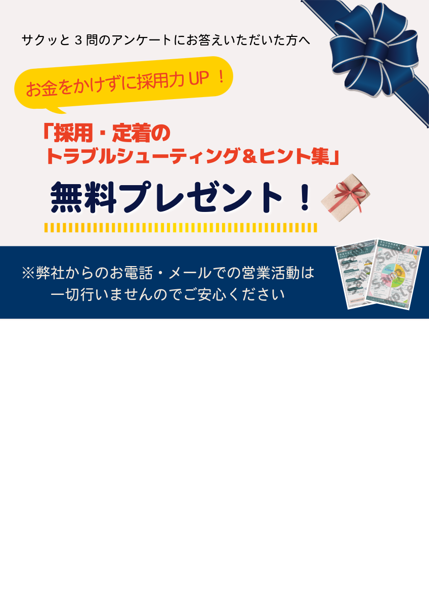 労務DX化のアンケート3問に協力いただくと、採用・定着トラブルシューティング&ヒント集をプレゼントします。